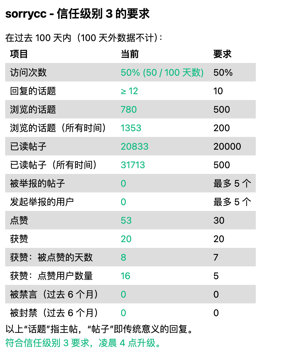 1、https://connect.linux.do/ 可以看自己的等级和升下一级的要求,对照着数据来,升起来还是很快的。
