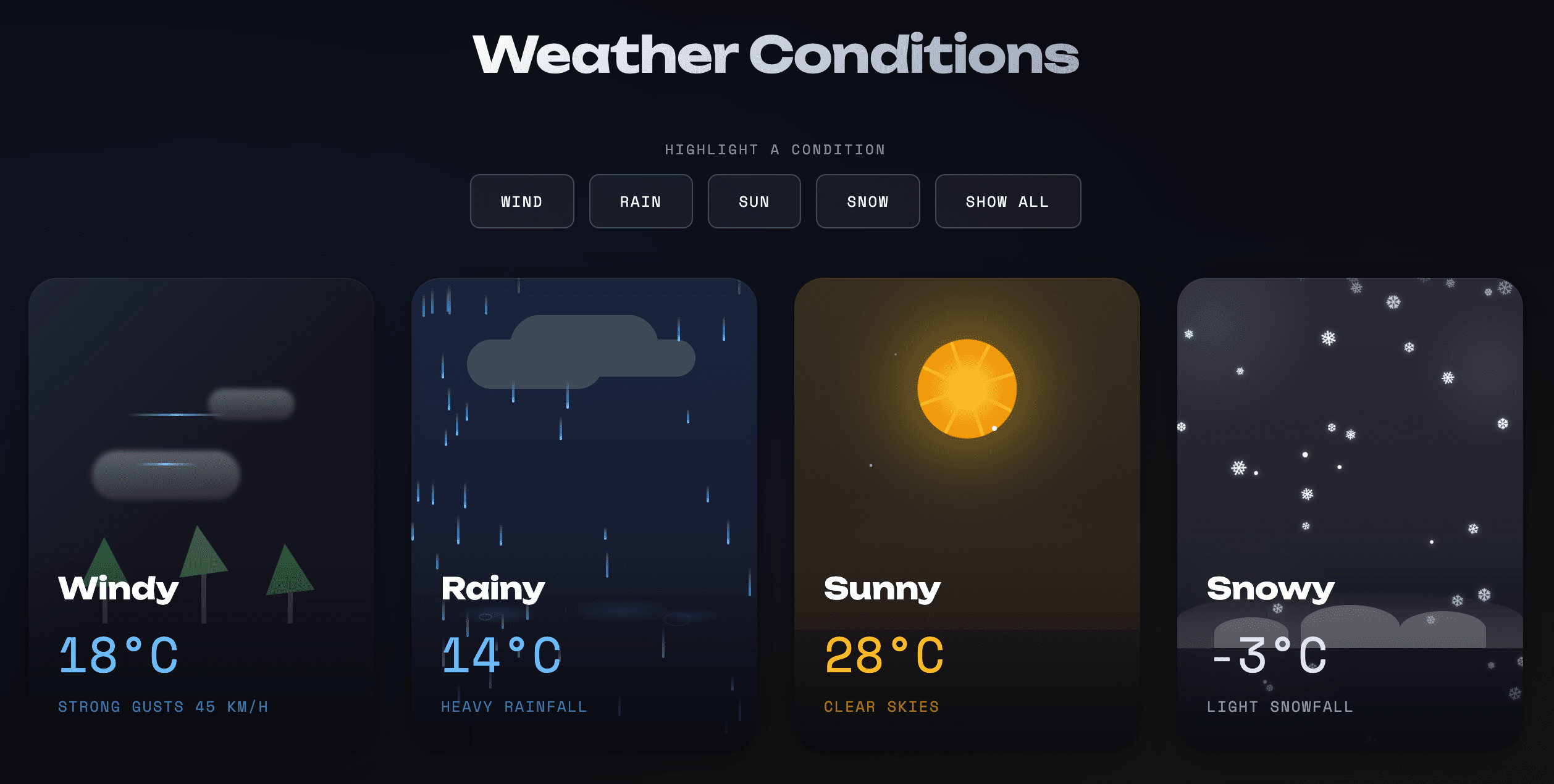 Create a single HTML file containing CSS and JavaScript to generate an animated weather card. The card should visually represent the following weather conditions with distinct animations: Wind: (e.g., moving clouds, swaying trees, or wind lines) Rain: (e.g., falling raindrops, puddles forming) Sun: (e.g., shining rays, bright background) Snow: (e.g., falling snowflakes, snow accumulating) Show all the weather card side by side The card should have a dark background. Provide all the HTML, CSS, and JavaScript code within this single file. The JavaScript should include a way to switch between the different weather conditions (e.g., a function or a set of buttons) to demonstrate the animations for each.